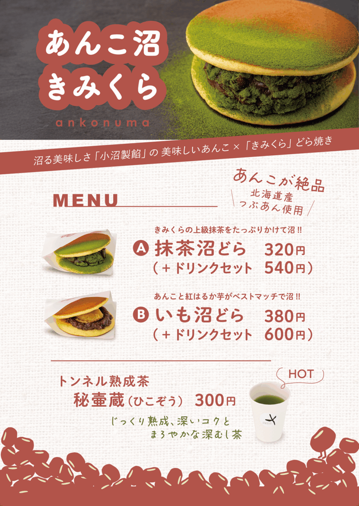 日本茶きみくらの餡を手がける小沼製餡と、今回のイベント限定でコラボレーション。”あんこの美味しさに思わず沼にハマってしまう”をテーマに、こだわりのあんこをたっぷり使った特製どら焼きをご用意いたしました。