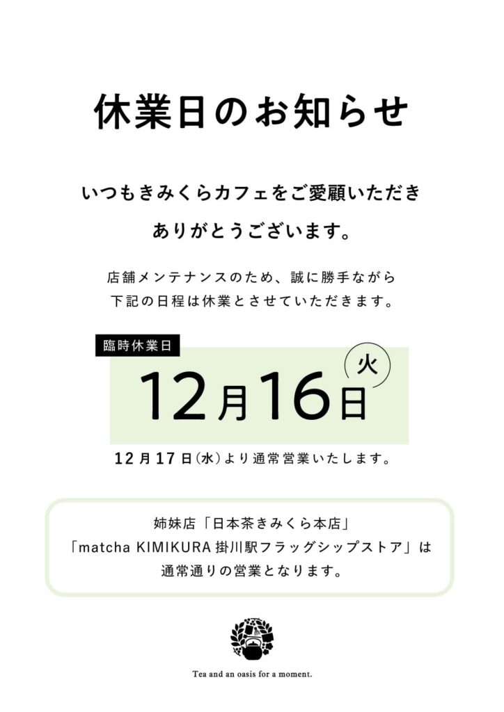 2025年12月16日(火) は、きみくらカフェを休業とさせていただきます。